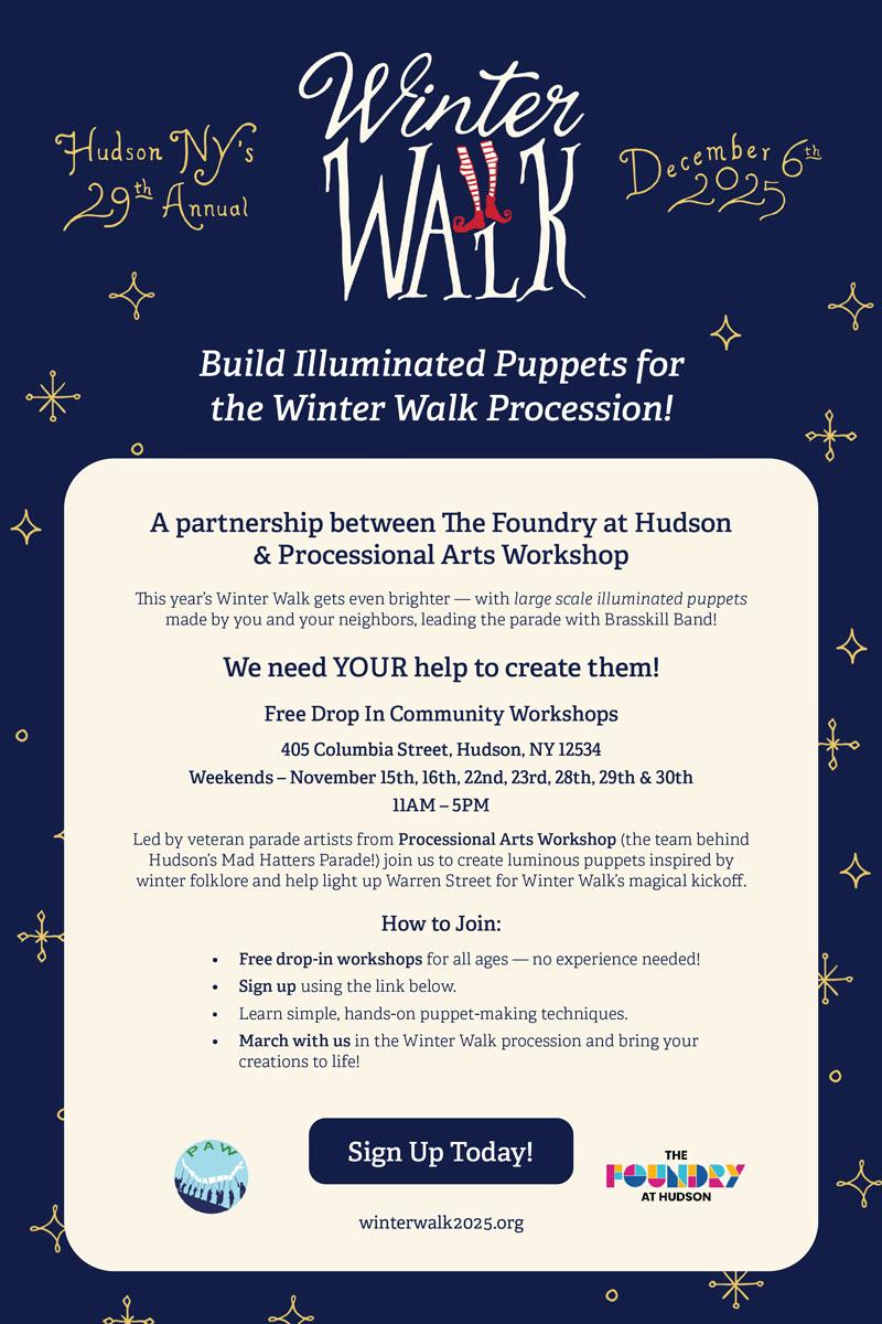 Home Events - Trixie's List Arts Community Event Performance Processional Arts Workshop – Free Drop In Community Workshops Processional Arts Workshop – Free Drop In Community Workshops + Add to Google Calendar + iCal / Outlook export Date Nov 29 2025 Time 11:00 am - 5:00 pm More Info Sign Up Today Location 405 Columbia 405-407 Columbia Street, Hudson, NY Category ArtsCommunity EventPerformance Sign Up Today Share this event